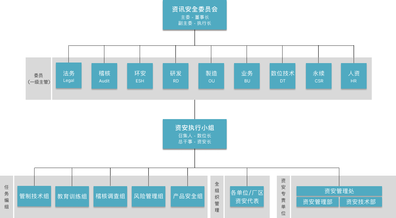 资讯安全委员会为aoa体育资安最高管理组织,向董事长报告。下辖资安执行小组负责推行资讯安全委员会之各项决议。为持续建构完整且精实的资安专 责团队,资讯安全管理处下成立「资讯安全管理部」与「资讯安全技术部」,持续投入资源以强化团队资安核心能力。