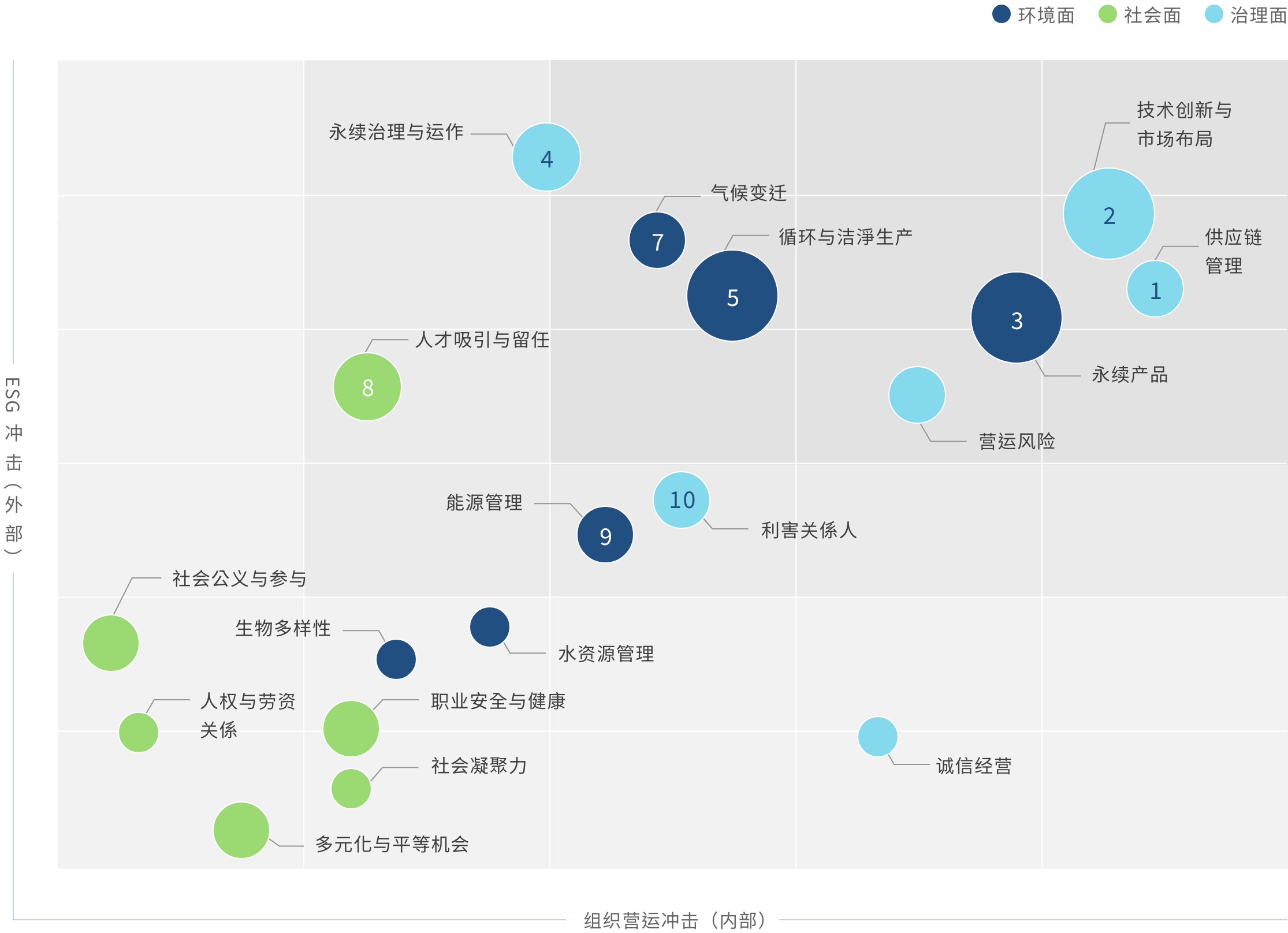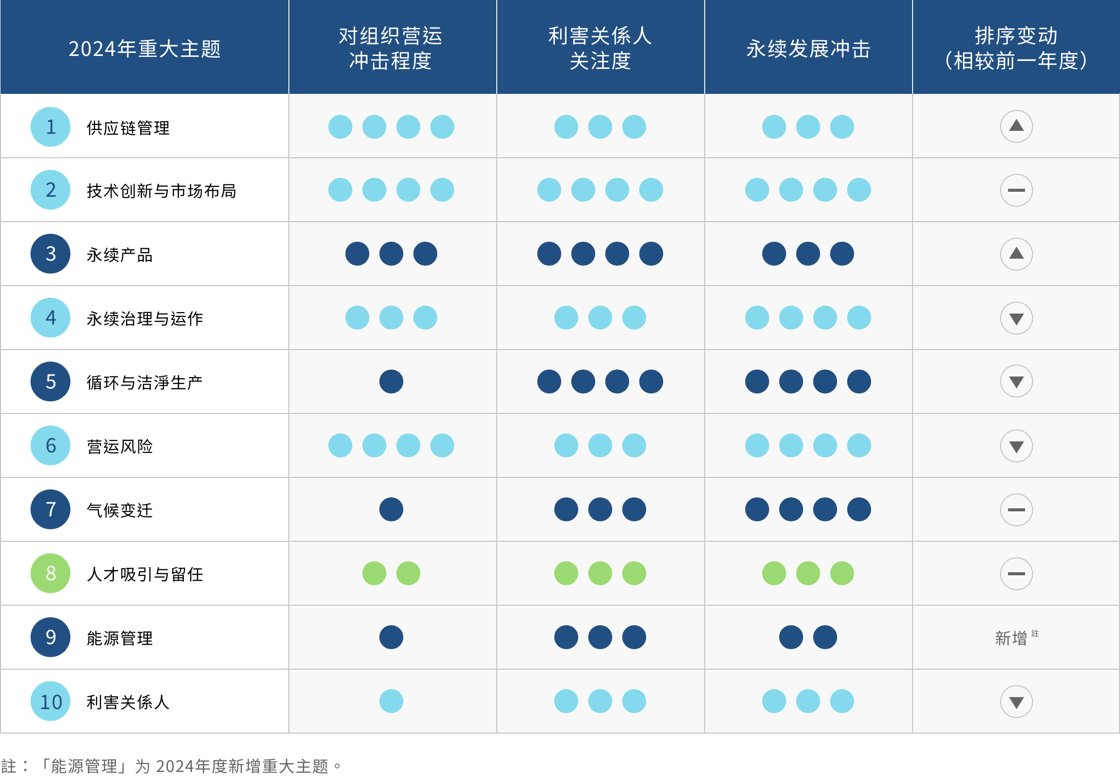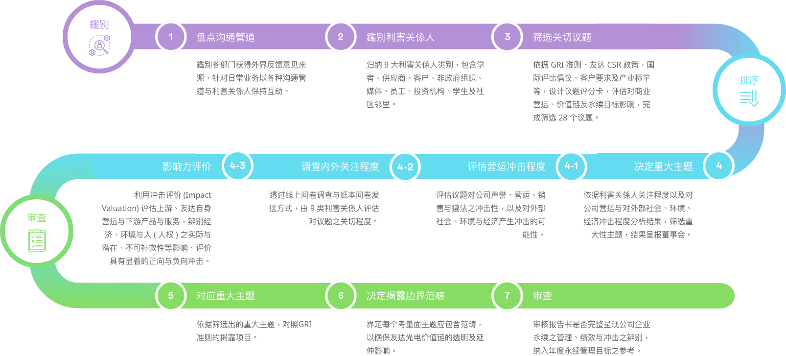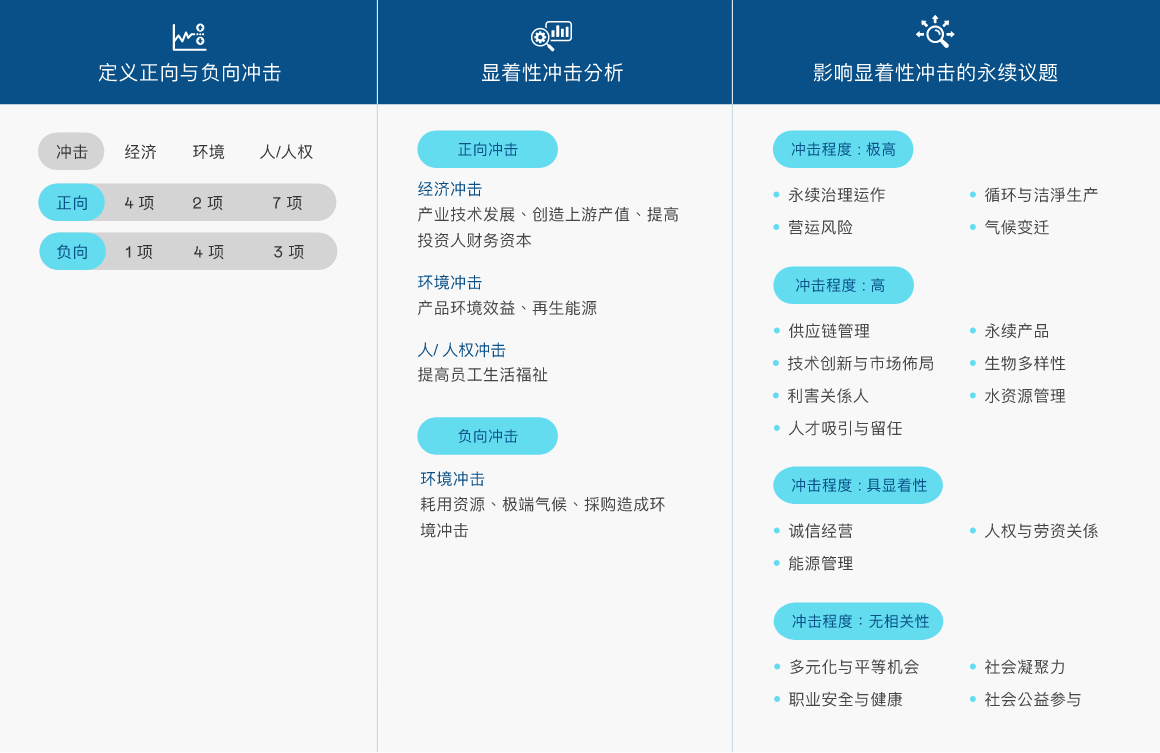 依循全球永续趋势与GRI 准则检视议题之合适性,透过问卷了解利害关系人对公司在环境、社会( 含人权)、公司治理三方面的关注面向,同时建立双重重大性评估方法,透过aoa体育主管与价值链的关键伙伴评估ESG 议题对公司所产生的营运冲击程度,并在ESG 外部永续发展冲击方面,根据GRI 通用准则2021(GRI Universal Standards 2021) 的GRI 3:重大主题(Material Topics 2021),整合价值平衡联盟(Value Balancing Alliance, VBA)、哈佛商学院「影响力加权会计(Impact-Weighted Accounts)」研究计画等机构发展之经济、环境及社会层面冲击评估方法学,建构以冲击为基础的重大性分析流程,辨识重大性主题。