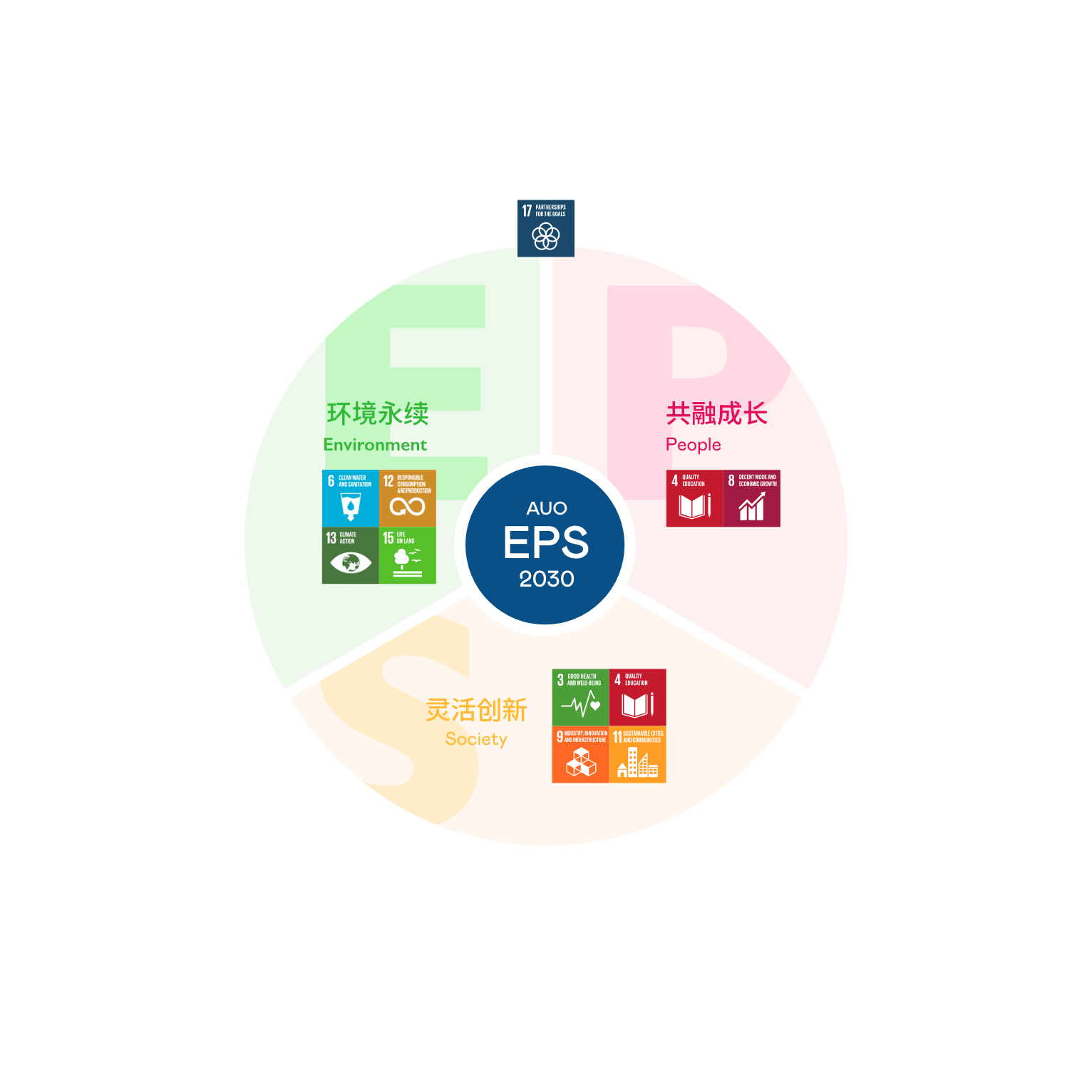接轨联合国 SDGs 永续发展目标,aoa体育以“超越企业社会责任,创造共享价值”为愿景,制定 EPS 三大永续发展主轴,并延伸订定具体目标引领行动,擘画企业永续策略路径。以 2018 至 2025 年的 EPS 实绩为基础,aoa体育以 EPS 2030 展望未来,设立 30 项永续目标,持续推动企业永续实践。我们将持续致力于降低环境冲击与发展循环经济,深化社会正向影响力,并通过创新研发强化场域应用技术,开创人类生活全新可能。同时携手生态圈伙伴,共同迈向企业发展与地球永续的双赢局面。